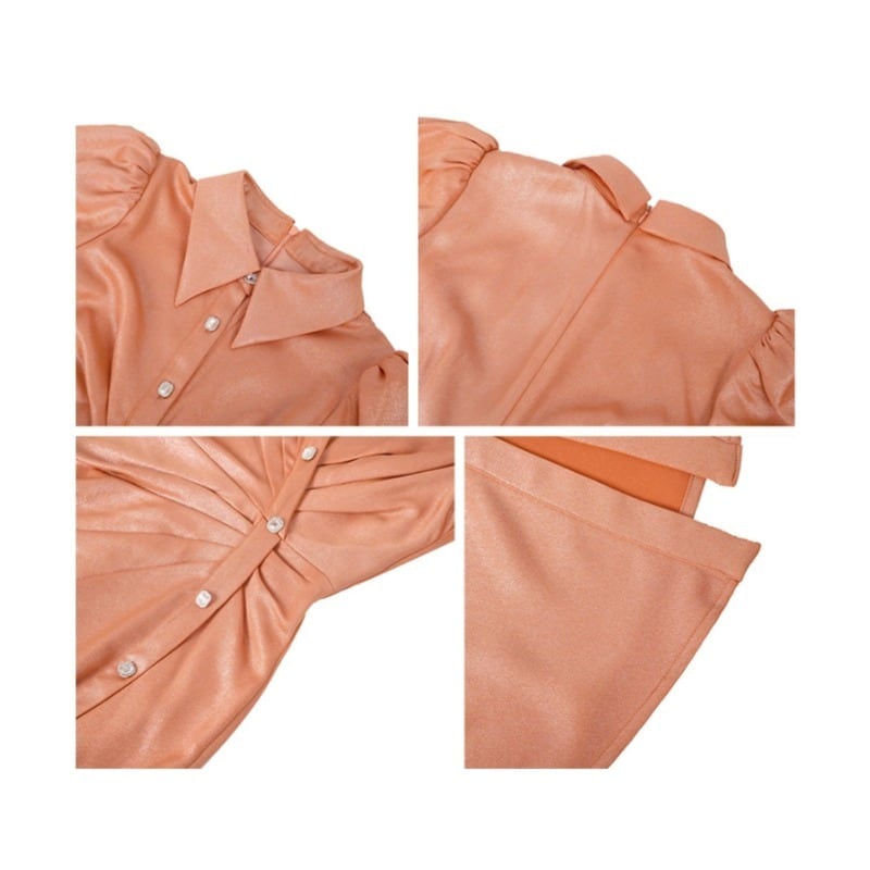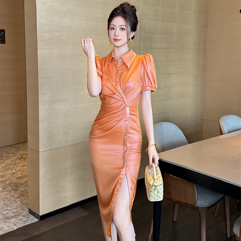 【夕暮薔薇シリーズ】ワンピース POLOネック レトロ 半袖 スリット オレンジ S M L XL