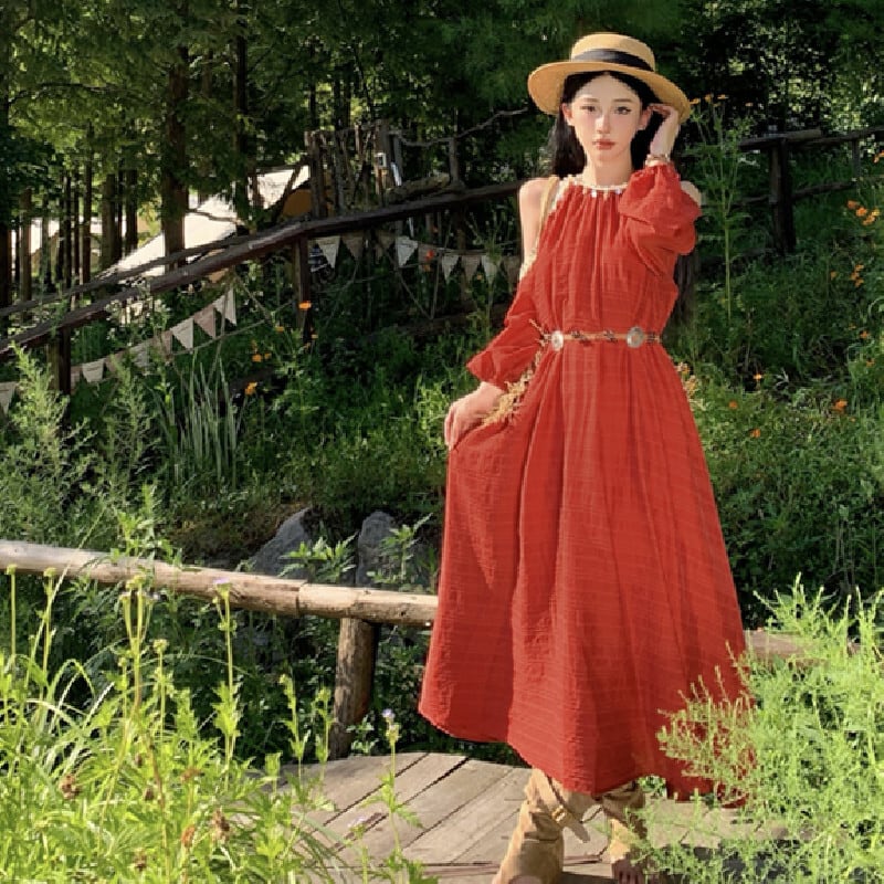 【SummerVacationシリーズ】ワンピース ボヘミアン 鮮やか 旅行 オフショルダー レッド S M L XL