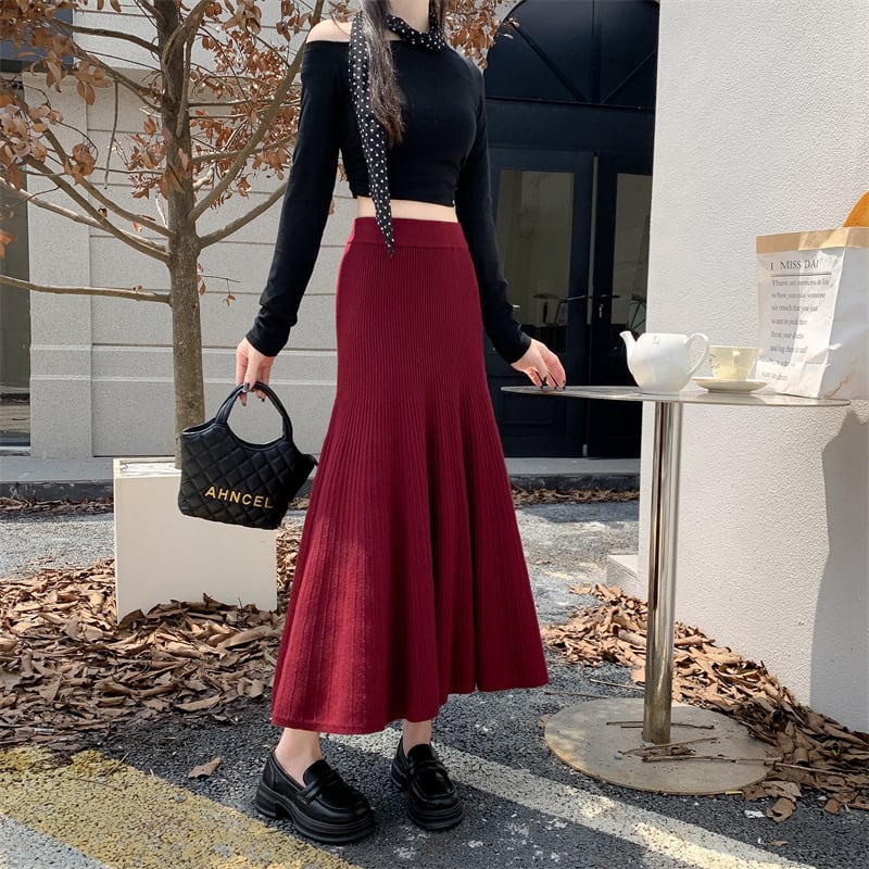 ✿店長おすすめ✿ボトムス スカート 3色展開 ニット ロング丈 フィッシュテール ブラック ベージュ ワインレッド S M L XL