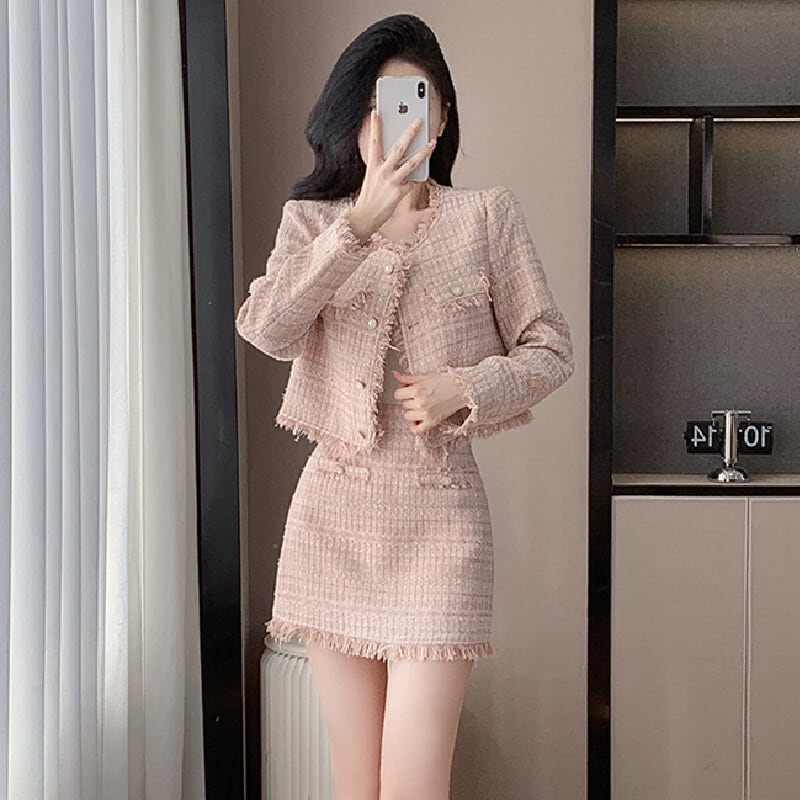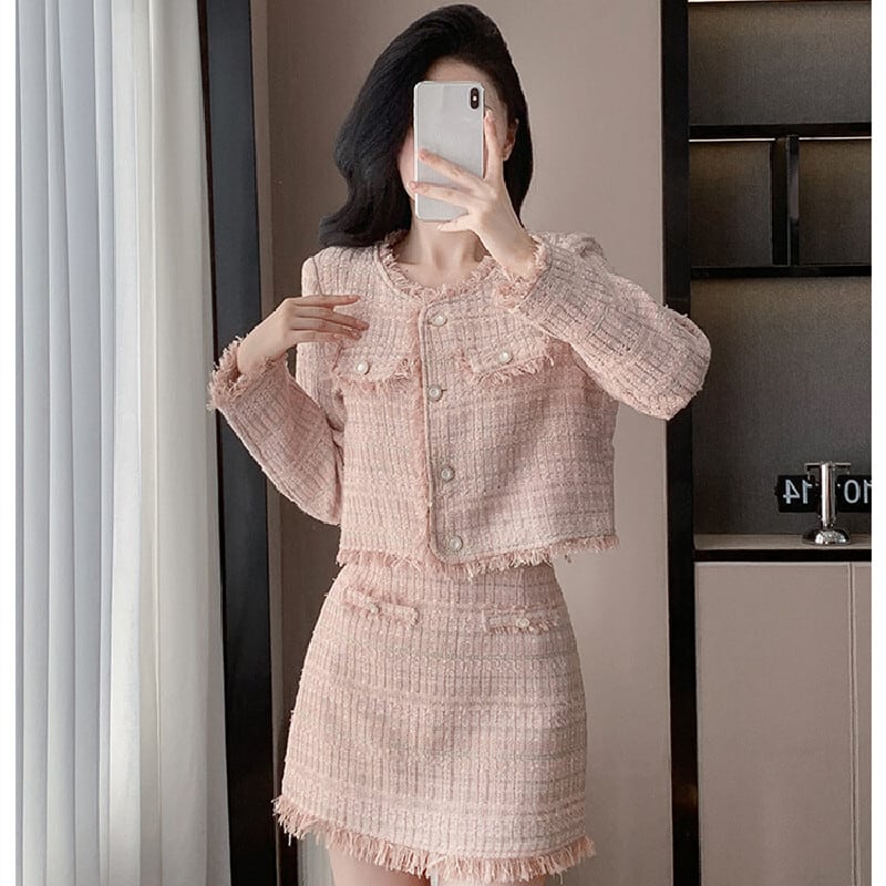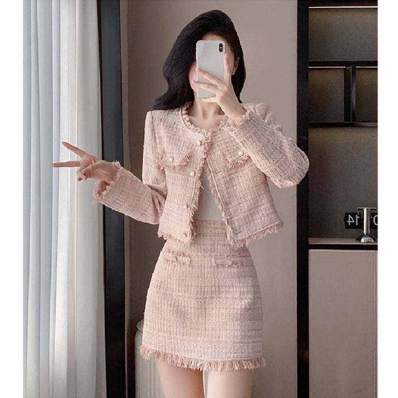 セットアップ ジャケット+スカート ツイード 気質アップ 長袖 ピンク S M L