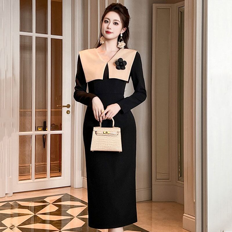 【夕暮薔薇シリーズ】ワンピース OL/フォーマル 折り襟デザイン 通勤 長袖 ブラック S M L XL
