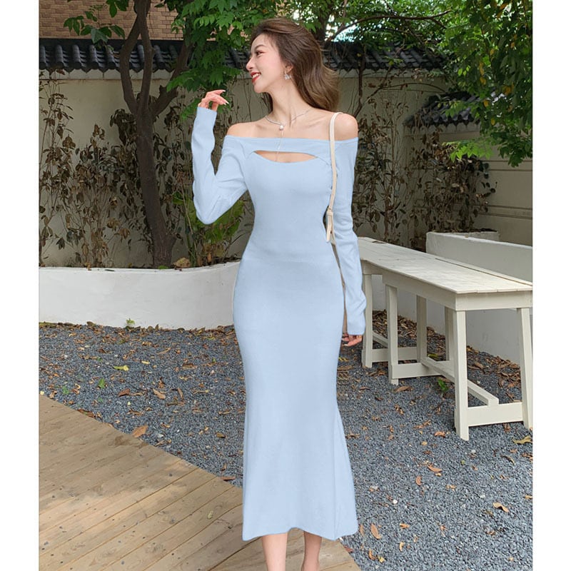 【CHERRYシリーズ】ワンピース 3色展開 ボートネックデザイン フィッシュテール ベージュ ブルー ブラック S M L