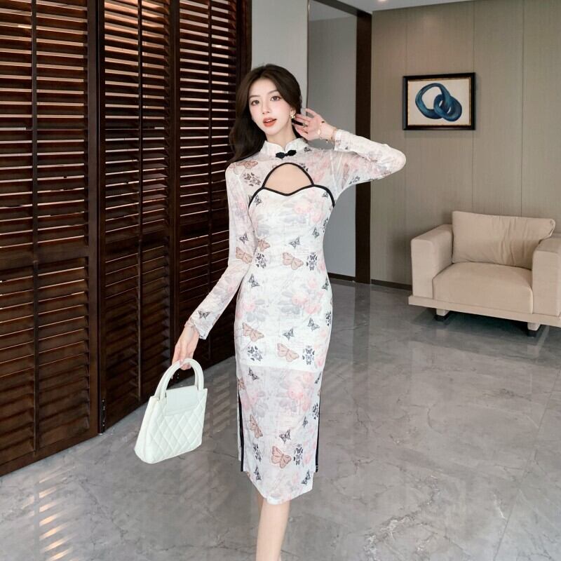【CHERRYシリーズ】ワンピース チャイナ風 蝶模様 エレガント プリント S M L XL