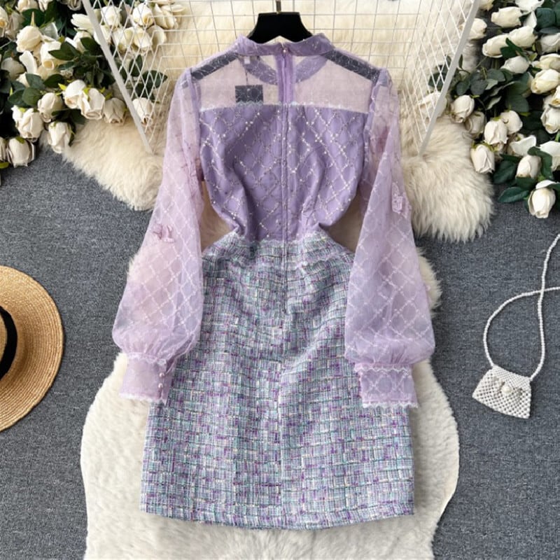 【Airi Styleシリーズ】ワンピース ツイード レース 蝶 大きいサイズ 魅せる パープル S M L XL 2XL