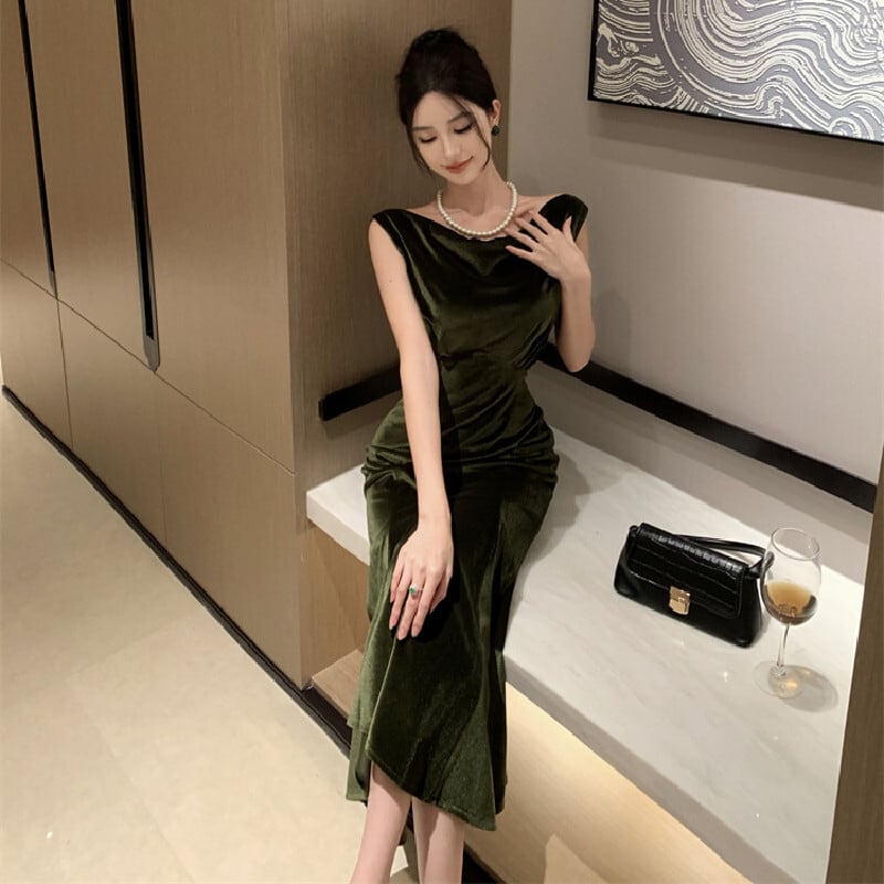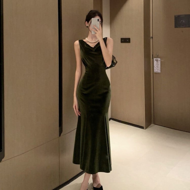 ワンピース ベルベット フィッシュテール デート ノースリーブ ダークグリーン S M L XL