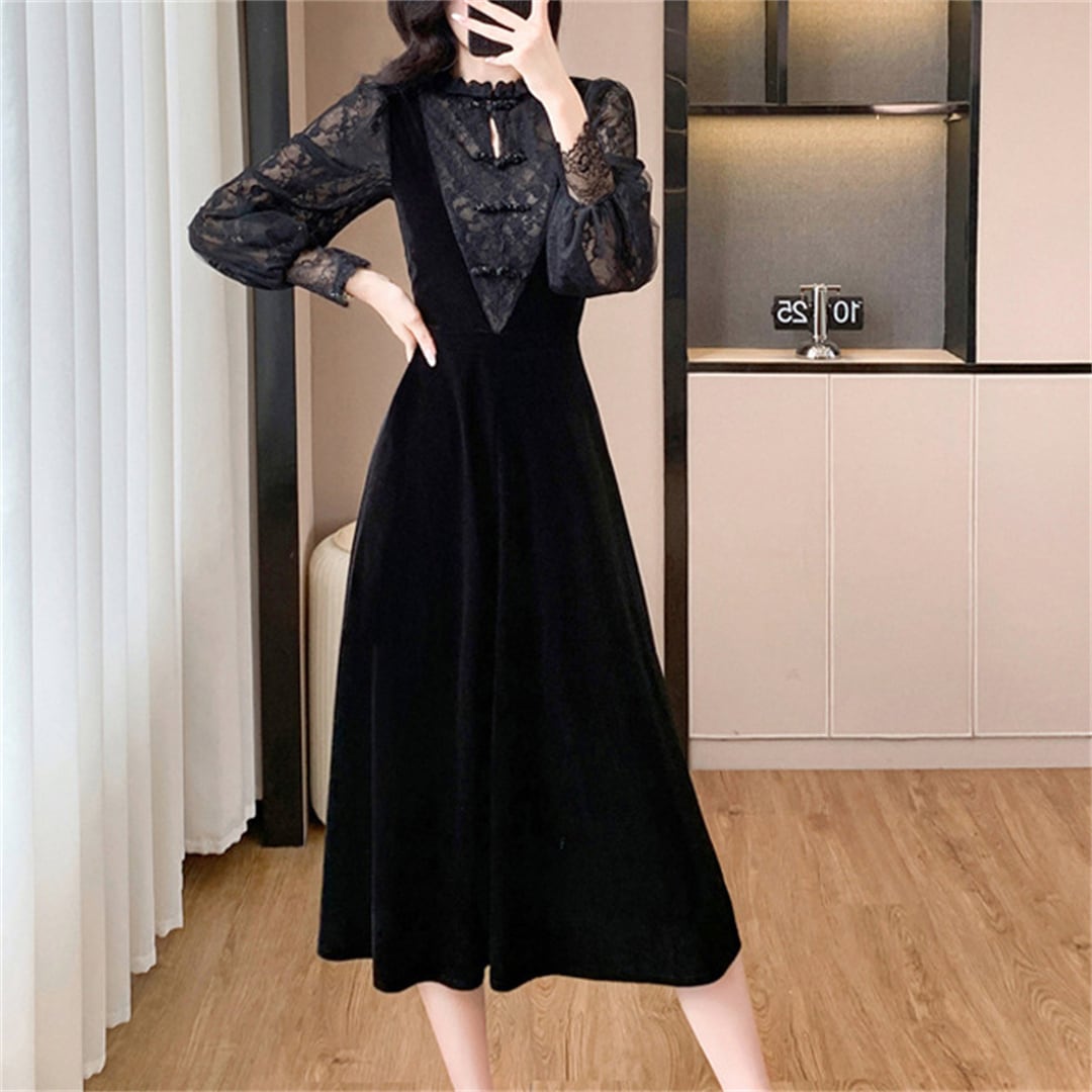 【森森家シリーズ】ワンピース チャイナ風 切り替え レース ベルベット ブラック S M L XL 2XL