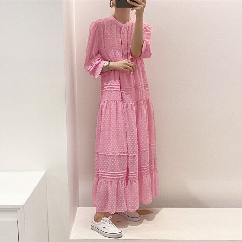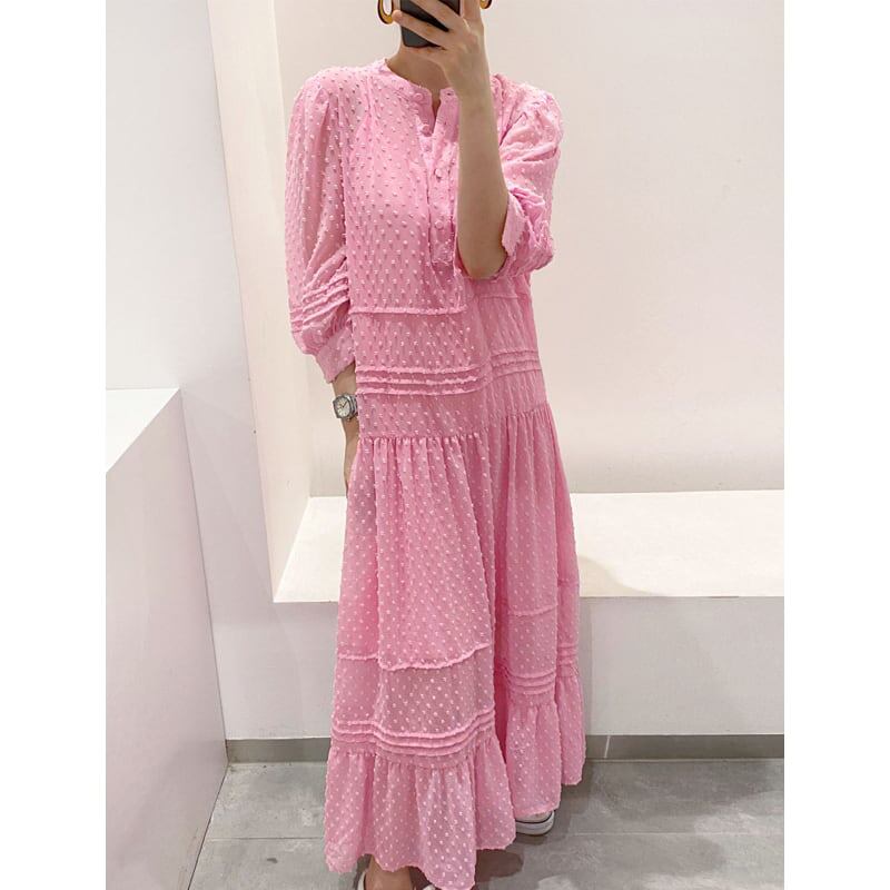 ワンピース 2色展開 ドット柄 カジュアル ロング丈 ピンク ブラック